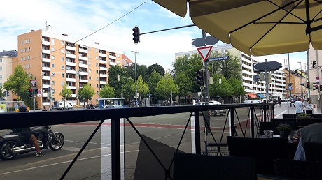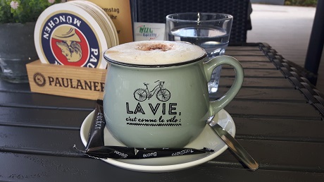 Gesagt, getan! An einem schönen Sommertag verließ ich meinen Balkon und begab mich auf Straßenniveau. Trotz lockerer Bestuhlung war auf der Terrasse noch reichlich Platz. Rasch war die Bedienung zur Stelle, so dass ich einen Cappuccino ordern konnte. Schon die mir vertrauten Geräusche aus dem Inneren des Cafés ließen auf eine professionelle Kaffeemaschine schließen.