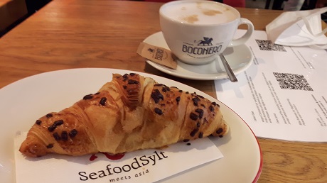 Die Security bei der Kontrolle bemüht sich genauso um Freundlichkeit, wie ich. Schließlich ist es auch verdammt früh. Im Terminal 2 hat die Gastronomie noch geschlossen. Bis auf einen Fischhändler in der Nähe meines Gates – Seafood Sylt. Muss sagen, der Cappuccino ist gut hier und die Croissants, frisch, sogar noch warm. Das tröstet über den hohen Flughafenpreis hinweg.