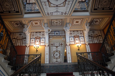 Doch näher war ihr ihre erklärte Lieblingsstatue, die unten im Garten zu finden ist: der „sterbende Achill“, wie er versucht sich den vergifteten Pfeil des Apoll aus der einzig verwundbaren Ferse zu ziehen. Zu spät! Achill wird sterben. Doch dies ist nicht die einzige bemerkenswerte Statue auf dem weitläufigen Grundstück: in der Säulenhalle des Peristyl, einer von Kolonaden eingefassten Terrasse im ersten Stock, stehen 13 Büsten griechischer Philosophen – und William Shakespeare! Ein Zufall, auf den wir noch einmal zurückkommen werden. Dazu Plastiken der neun Musen, der drei Grazien und des Apoll.