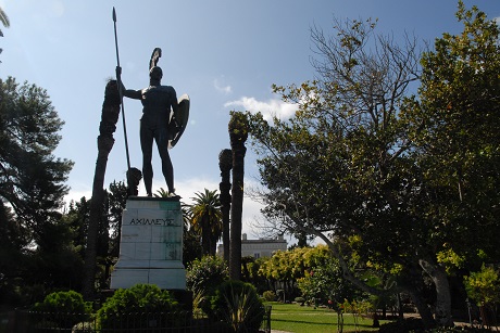 Wohl deshalb lies er im hinteren Teil des Gartens eine 5,5 Meter hohe Statue des Achill im neobarocken Stil errichten, sozusagen als Kontrapunkt zum leidenden Achilles der Kaiserin. Denn „sein“ Held steht aufrecht mit Schild und Speer und blickt furchtlos in die Zukunft. „Sein“ ist hier wörtlich zu nehmen: der Kaiser hat die bronzene Figur selbst so entworfen.