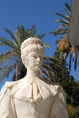 Doch aus Sisis Wunsch, hier auf Korfu endlich Ruhe und Frieden zu finden, wurde nichts. Noch während der Bauarbeiten erfuhr sie vom Freitod ihres Sohnes Rudolf. So nahm sie ihr ruheloses Reiseleben wieder auf, lang hielt es sie nie an einem Ort, bis 1898 ein Anarchist ihrem Leben ein gewaltsames Ende setze. Ähnlich dem sich unverwundbar wähnenden Achill, hatte sie das Eindringen einer schmalen, scharfen Klinge nicht bemerkt. Als sie Minuten später tödlich getroffen zusammenbrach soll sie noch gesagt haben: „Aber was ist denn mit mir geschehen?“. Nur 60 Jahre alt ist sie geworden, die unglückliche Kaiserin. Eine Statue von ihr, die so gar nicht nach Romy Schneider aussieht, begrüßt die Gäste vor dem Eingang des Hauses…