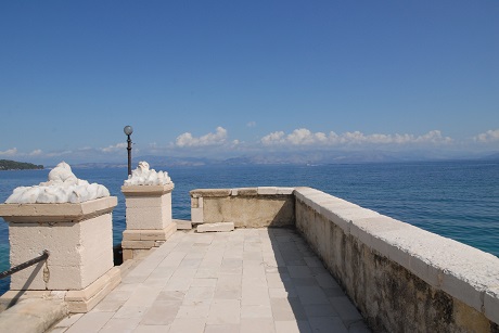 Ausgerechnet das Café Achilleion hat geschlossen – dem Zustand des Verfalls nach wohl auf Dauer. Doch nach so viel Kultur, Geschichte und Mythologie brauche ich erstmal einen Kaffee. Zur Auswahl stehen dann noch das San Marino Café, was aber eher eine Taverne ist, die Snack Bar, das Achilleion Snack Café und das La Nova Bella Vista. Letzteres besticht mit einer Terrasse und einem Blick besticht, wie ihn nur wenige Meter entfernt Kaisers beim Nachmittags gehabt haben.