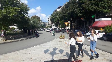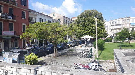 Kommt man von Norden und will zum Zentrum, Achilleion, Flughafen oder nach Süden oder Westen, dann muss man zwangsläufig durch das Chaos. Doch in diesem Fall hat man noch Glück, muss man doch nur kurz über eine der beiden Schmalseiten über den Platz und kann sich dann sofort nach rechts in die erste Gasse verdrücken. Will man zum Zentrum (und wenn man den nicht ausgeschilderten Weg über den Hafen nicht kennt), muss man ganze drei Seiten des Plateia Georgiou Theotoki umfahren. Beziehungsweise umstauen, denn hier fließt der Verkehr nicht, er stockt. Hilfreich ist hier eine gewisse Rücksichtslosigkeit, die man den anderen Verkehrsteilnehmern idealer Weise an den Tag legt – schließlich will man sich ja nicht unbedingt als Tourist zu erkennen geben! – und der Glücksfall, dass es hier keine Radfahrer gibt, die man beschädigen könnte.
