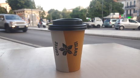 Von Gardiki bin ich zügig über Gastoúri und Kanáli nach Kérkyra gekommen, trotz des Berufsverkehrs. Nach dem Kreisel am Flughafen wird es etwas verwinkelt und man kommt unweigerlich zum Plateia Georgiou Theotoki. An der Ecke zur Polichroniou Kostanta, der Straße, die nach Norden führt, ist eine der zwei Filialen der griechischen Kaffee-Franchise-Kette Coffee Island. Letztes Jahr auf Kos habe ich bereits Bekanntschaft mit diesem Unternehmen gemacht.