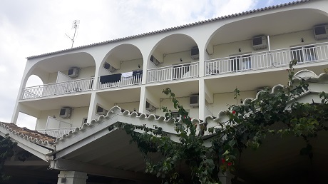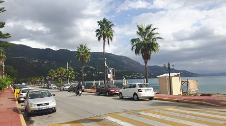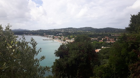 Auf der Uferpromenade geht es bis zum anderen Ende der Bucht. Dann schraubt sich die Straße die nächste Anhöhe hinauf. Die Straße ich hier gut ausgebaut. Trotzdem ist der Wechsel von gemütlicher Promenade zu Serpentinen Anstrengend. Als ich die Anhöhe erklommen habe werfe ich einen Blick zurück. Verführerisch liegt Ípsos in seiner Bucht mit all seinen Verheißungen. Wäre ich Odysseus, ich hätte mir die Bucht ausgesucht um auf Korfu zu landen und meine Nausikaa zu treffen.