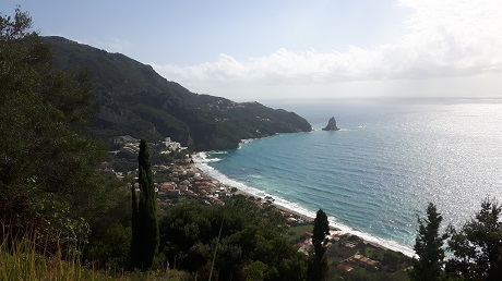 Kaum ist man über den Bergsattel, eröffnet sich einem die Bucht von Agios Giorgios. Ein weißer Strand, ein Dorf eingeklemmt zwischen Bergen, Hotelbunker, die von Weitem aussehen wie der Kühlergrill eines Autos. Steil stürzt sich die Straße den Hang hinunter, kaum mehr als drei oder vier sehr scharfe Kurven, dann geht es an Kiosken und Souveniergeschäften direkt zum Strand.