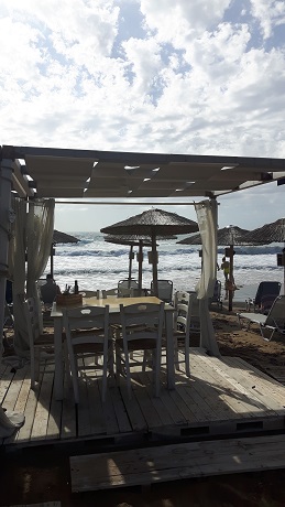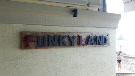 Ich stelle den Roller direkt dort ab, wo die Straße in den Strand übergeht. Gleich im ersten Café bleibe ich hängen, obwohl der Name „Funkyland“ auf mich eher abschreckend wirkt. Ich bekomme einen Tisch direkt am Strand aber doch weit genug vom Wasser weg, um nicht Opfer einer vorwitzigen Welle zu werden. Eine sehr nette und humorige Bedienung ist schnell zur Stelle und mir scheint ein Cappuccino freddo am ehesten der Situation angemessen zu sein.