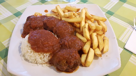 Zu erwähnen wäre noch das Essen vom Vorabend. In einer relativ unscheinbaren Taverne an der Dorfstraße hatte ich ein vorzügliches Keftedakia, Fleischbällchen in Tomatensauce mit Pommes. Mehr brauchte ich nicht, ich musste doch noch überschüssige Getränkevorräte vernichten, was mir mit einsamer Disziplin auch gelang.