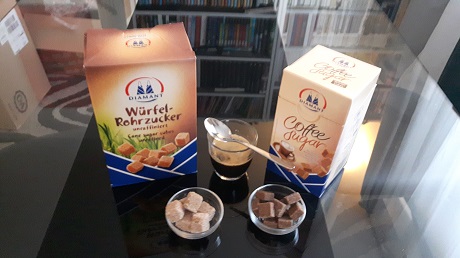 Die Würfel von braunem Rohzucker sind in der Regel etwas gröber und etwas größer. Seit kurzem gibt es von Diamant auch „Coffee Sugar Cubes“ in den kleineren Würfeln von zwei Gramm. Hier werden zwei Vorzüge kombiniert: der schnell lösliche Kandisfarin mit der kleineren Würfelgröße. Es gibt Kaffeefreunde, die schwören auf Rohrzucker, besonders wenn es sich um Rohrohrzucker handelt, der leicht Wasser zieht und oft als klebriger Batz daherkommt. Ich persönlich bin ein Freund des Kandisfarins, aber das ist reine Geschmackssache…