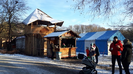 Ich übrigens auch. Warum ich dieses Risiko einging? Nun, dieser See ist nicht tief und er war an der Stelle, wo ich ihn überquerte bereits bis zum Grund durchgefroren. Apropos durchgefroren! Jetzt war es an der Zeit sich am Seecafé „Gans am Wasser“ einzufinden um ein Heißgetränk zu erwerben. Allerdings war die Schlange bei der Kaffeeausgabe absurd lang und nach Getümmel stand mir in Corona-Zeiten nicht der Sinn. Doch da entdeckte ich einen neuen Anbau, ganz im Hexenhäusl-Stil des Giesinger Partnerunternehmens „Gans woanders„. Hier wurde schlangenlos Glühwein verkauft.