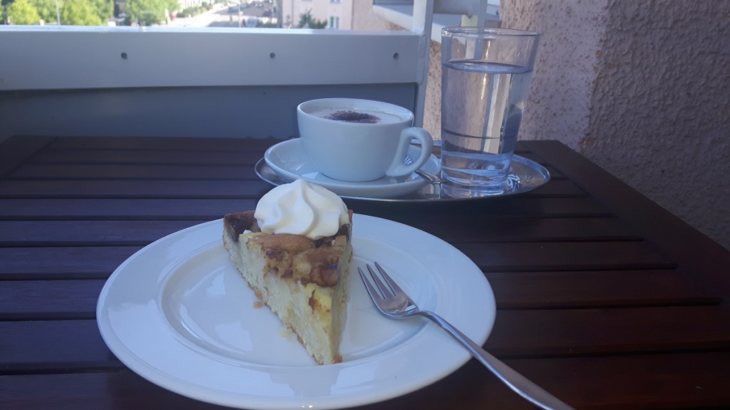 So, wie dieses Bild: Kaffee und Kuchen am Balkon. Anlässlich des vierjährigen Jubiläums von Coffeenewstom ein Apfelkuchen mit Walnuss und Sahnehaube. Dazu ein ordentlicher Cappuccino. Das pure Leben. Sonst nichts…