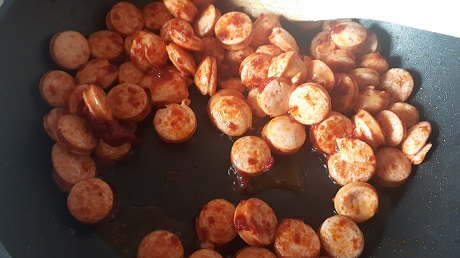 Die Zubereitung ist schnell erklärt: Würstchen in Scheiben schneiden, eine Dose Tomaten öffnen und alles in eine Pfanne schütten. Die nun folgende Langfassung macht das Gericht nicht wirklich komplizierter: wir brauchen 200 g Würstchen. Da passen natürlich türkische Würstchen aus dem türkischen Supermarkt, Geflügel-Wiener oder Mini Cocktail-Würstchen. Ich behelfe mir mit Geflügel-Wiener vom Penny. Die Würstchen werden in Scheiben geschnitten und angebraten. Um das Tomaten-Aroma zu verstärken und für ein paar Röstaromen gebe ich noch etwas Tomatenmark dazu und lasse es ein wenig schmurgeln.