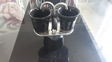 Die Zubereitung eines Mokka mit der Bialetti ist ja praktisch ein Kinderspiel: Wasser bis unter das Ventil einfüllen, Filter drauf, Kaffeepulver rein – nicht festdrücken! – zuschrauben und ab auf den Herd damit. Oder auf eine andere beliebige Wärmequelle. Alex von Tausendkilometer wäre dafür Spezialist! Jetzt muss man nur noch abwarten, bis sich der Kaffee seinen Weg nach oben bahnt um bestimmungsgemäß die beiden schwarzen Tassen zu füllen.