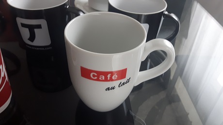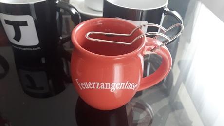 Schließlich noch die Feuerzangentasse. Obwohl bepfandet, schaffte sie es von einem Weihnachtsmarkt bis zum Taxistand Harras. Da keine Pfandmarke dabei war, konnte der Pfand nicht eingelöst werden. Warum auch, war sie doch schon als nicht zahlender Passagier an Bord meines Taxis gelandet. Mit dem cleveren Mechanismus könnte man sie für eine Tasse Feuerzangenbowle verwenden: die Klammer oben fasst ein Stück Würfelzucker. Es funktioniert, ist aber wieder kein Kaffee…