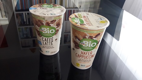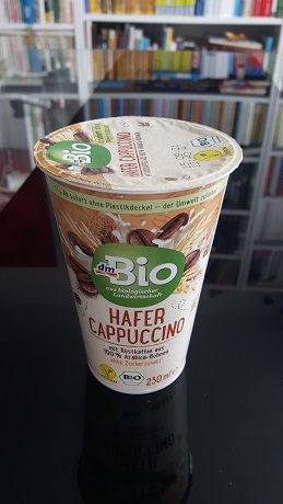 Da lachten mich zwei neue Kaffeedrinks im Getränke-Regal bei dm an. Kurzerhand mit zur Kasse genommen und erstmal in den Kühlschrank gepackt – obwohl ungekühlt haltbar, da hocherhitzt. „Caffè Latte“ verspricht Röstkaffee aus 100% Arabica-Bohnen und Alpenmilch, „Hafer Cappuccino“ 100% Röstkaffee und glutenfreien Haferdrink. Letzterer ist ohne Zuckerzusatz, beide aber aus biologischer Landwirtschaft.
