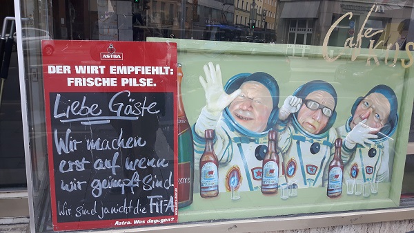 Beim legendären Café Kosmos Mars- Ecke Dachauer Straße hat die Wartezeit auf die Wiedereröffnung allerdings einen handfesten Grund. Eine Tafel im Schaufenster, auf der sonst die Tagesgerichte vermerkt sind, erklärt, dass man schlicht noch nicht geimpft sei und deshalb noch warten wolle. Man sei ja schließlich nicht die FIFA. Dem ist nicht hinzu zu fügen.