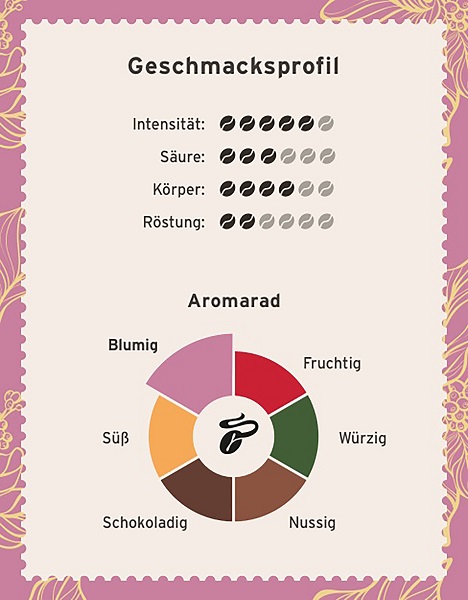 Ganz besonders ist auch das Geschmacksprofil der neuen Kaffeerarität, die per Hand gepflückt, gewaschen und sonnengetrocknet wird. Zum ersten Mal seit dem das Aromarad für die Raritäten eingeführt wurde, gibt es einen blumigen Kaffee. Nach dem Handaufguss sowie nach der Zubereitung mit der Cafissimo Kapselmaschine erkennen wir blumige Noten, die Assoziationen von Jasminblüten wecken. Darüber hinaus schmecken wir einen Hauch Vanille, Ahornsirup und Lavendel heraus.