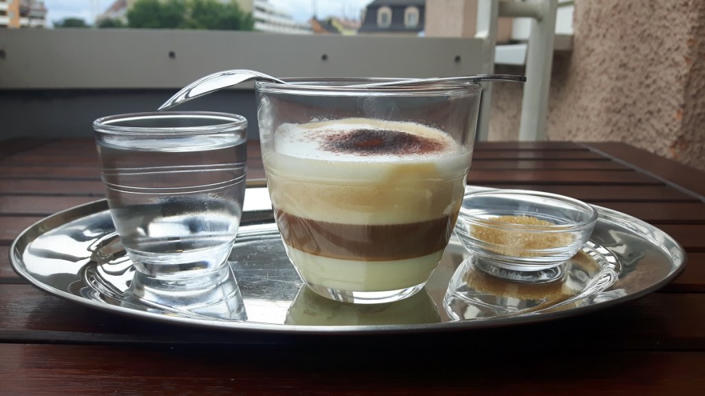 Für mich ist diese Challenge ja eine doppelte Herausforderung. Schließlich muss ich den Begriff der Woche mit dem Begriff Kaffee verbinden. Meine Idee dazu: ein Bild von einem Kaffee mit drei Schichten. Da hätte ich es mir einfach machen können und den Caffè leccese nehmen, aber den hatten wir erst vor ein paar Tagen. Oder den Latte macchiato, der – richtig zubereitet, auch drei Schichten hat: unten heiße Milch, in der Mitte Espresso und oben ein Häubchen aus Milchschaum.