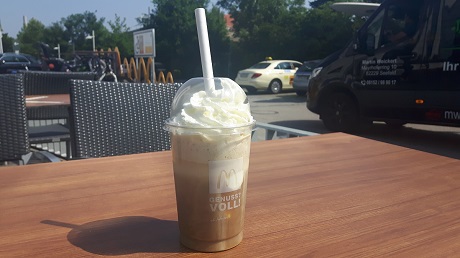 Doch wie sieht es mit dem Eiskaffee aus? Mit 3,89 Euro ist der zwar um einiges billiger als in der italienischen Eisdiele oder im Kaffeehaus, aber kann er mit der gewohnten Qualität mithalten? Also machte ich die Probe aufs Exempel und probierte den Eiskaffee in der McDonald’s-Filiale, die direkt neben der Deutschlandverwaltung liegt. Von den McDonalds hier in München dürfte hier die wohl lauschigste Terrasse des Burgerbraters sein.