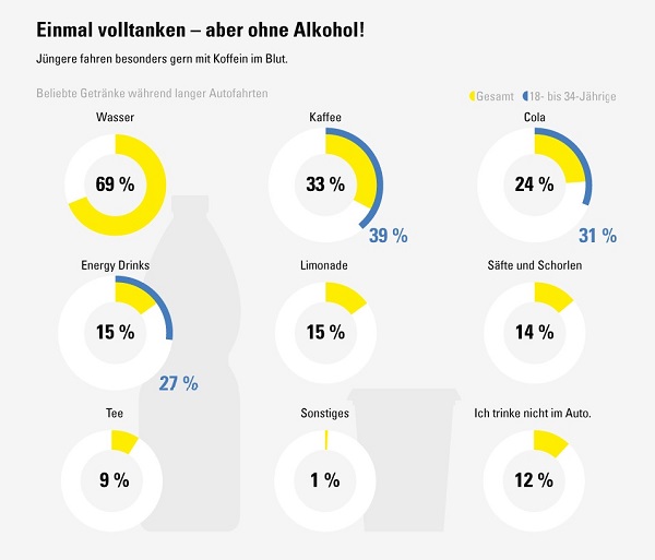 Dafür trinken die deutschen Pkw-Besitzer umso mehr – und zwar in erster Linie Wasser (69 Prozent). Besonders jüngere Fahrer zwischen 18 und 34 Jahren sind zudem gern mit Koffein im Blut unterwegs und greifen zu Kaffee (33 Prozent), Cola (31 Prozent) und Energy Drinks (27 Prozent). Damit ist Kaffee – nach Wasser – das beliebteste Mitnehm-Getränk für unterwegs. Kein Wunder, dass die Tankstellen und Raststätten zu den größten Kaffeeanbietern des Landes gehören.