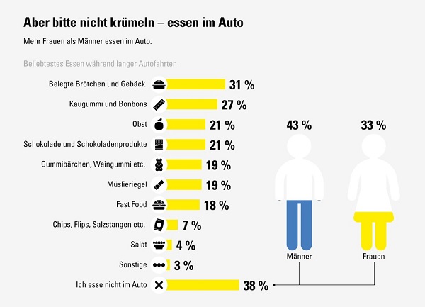 Die Studie zeigt auch andere interessante Gewohnheiten: Steht etwa eine lange Autofahrt bevor, will die Frage nach dem Reiseproviant geklärt sein. 31 Prozent der deutschen Pkw-Besitzer entscheiden sich hier klassisch für belegte Brötchen und Gebäck. Neben dem Pausenbrot sind außerdem Kaugummi und Bonbons bei 27 Prozent der Fahrer an Board – gefolgt von Snacks wie Schokolade (21 Prozent), Obst (21 Prozent), Gummibärchen (19 Prozent) und Müsliriegeln (19 Prozent).