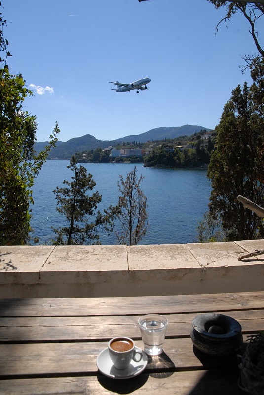 Wie man sieht gibt es dort Kaffee. Und – um dem Begriff „hinten“ gerecht zu werden – im Hintergrund ein Flugzeug im Landeanflug auf den nahen Flughafen. Das mit dem Hintergrund hat sozusagen einen Hintergrund, denn meine Insta-Beraterin Anne hat mir gesagt, ich solle doch mehr Bilder mit Hintergrund machen. Also vorne Kaffee und hinten Hintergrund in diesem Fall Bucht, Landschaft und Flugzeug. Nur wo genau? Die Auflösung kommt in den nächsten Tagen und Wochen…