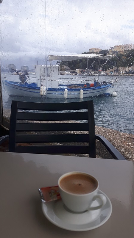 Zurück am Hafen suchte ich mir die schönste Taverne mit dem besten Blick auf Meer und Hafen. Jetzt war eine Stärkung fällig. Vor dem obligatorischen griechischen Kaffee gab es deshalb Bauernbratwurst mit Paprika und Feta in Tomatensauce, während ich langsam trocknete. Ein kritischer Blick zum Himmel ließ mich noch verweilen. Und in der Tat prasselte kurz darauf ein weiterer Schauer herunter. Gut, dass man hier durchsichtige Plastikplanen runterkurbeln konnte, die vor Wind, Regen und Spritzwasser schützen.