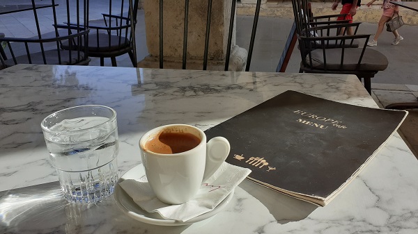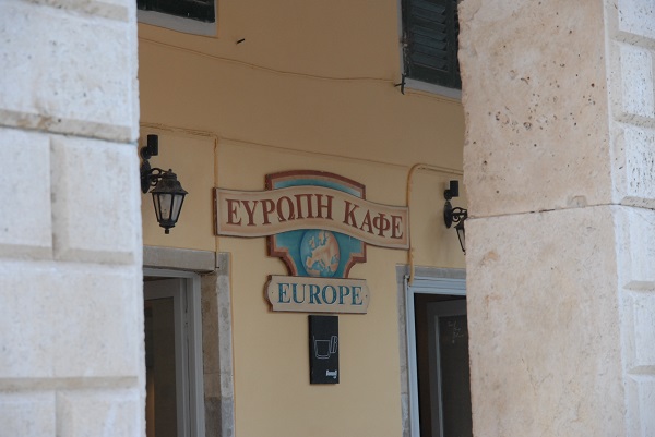 Während die Frontseite des Liston schon im Schatten liegt, habe ich beim Durchgang in der Mitte des langgezogenen Gebäudes noch einen Platz mit der letzten Abendsonne gefunden. Er gehört zum Europa Cafe und damit zu den Granden des Spianada. Durch den Spalt, den die Nikiforou Theotoki zwischen den Häusern lässt, fällt gerade genug goldenes Sonnenlicht in die Arkaden um einen zu wärmen. Den griechischen Kaffee habe ich mir redlich verdient.