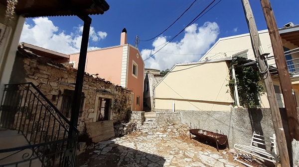 Vor dem Haus zur Rechten mit einer aufwendigen Terrasse stehen die Briefkästen für den ganzen Ort im typischen Blau der griechischen Post.