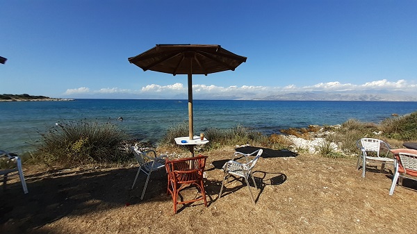 Mit den Palmen, die sich hier wohlfühlen, fast ein tropischer Strand. Die Taverne ist großzügig angelegt. Ein großer, lichter Innenraum, eine Terrasse unter einer großen, gelben Plane und dann noch beschirmte Liegen, Stühle und Tische direkt am Meer. Ein wundervoller Ort. Der Frappé ist eiskalt und kräftig. Nescafé halt. Niemand würde auf Korfu billigeren Instantkaffee anbieten! Ich zögere das Ende der Pause hinaus. Trotzdem muss ich irgendwann ja weiter. Denn auf mich wartet heute noch ein Geisterdorf…