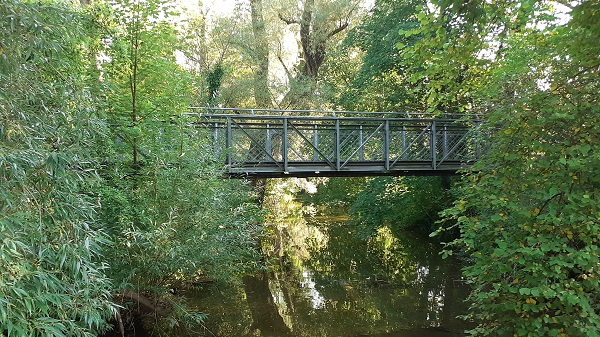 Ich folge dem Durchgang in Richtung Amper. Hier gehe ich vorbei an Hauswänden und Gartenmauern. Viel Platz ist nicht. Über den Silbersteg, eine schmale Brücke, erbaut um Michaeli im Jahr MDCCCII (1893) von Anton und Pauline Aumiller, wie eine Innschrift am Tor zum Steg verrät, erreiche ich die Kneipp-Insel, ein kleiner, verwilderter Park auf einer Amper-Insel. Hier befindet sich die kleine Kneippanlage mit einem Wassertretbecken und einem Becken zum Armbad.