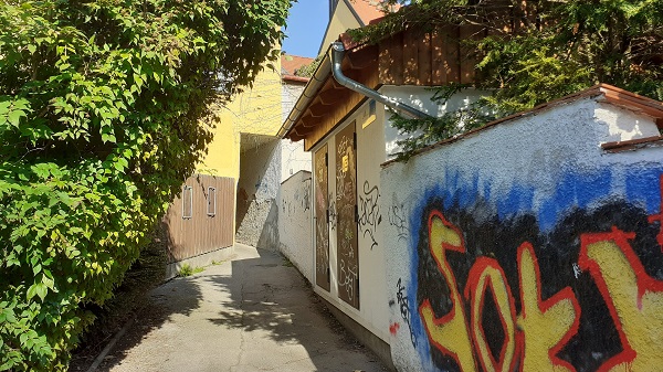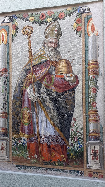 In einer Seitengasse entdecke ich mehrere Mosaike. Sie wurden um 1953 von dem Fürstenfeldbrucker Georg Brameshuber von einem Münchner Unternehmen gekauft und in die Wand des ehemaligen Café Brameshuber eingelassen. Um die Abbildung eines Bischofs ist eine Kontroverse entbrannt: ist er wirklich, wie jahrzehntelang angenommen, der Heilige Nikolaus? Der Bienenstock allerdings deutet darauf hin, dass es auch der Heilige Ambrosius sein könnte. Die interessante Hauptstraße birgt sicher noch viele Geheimnisse. Allerdings ist mir gegenüber von der Conditorei Wiedemann noch eine Gasse aufgefallen, die ich erkunden möchte.