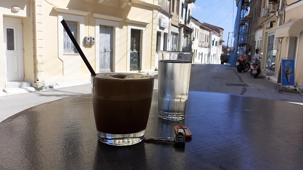 Man erkennt mich sofort als Fremden, grüßt und bedient mich aber freundlich. Ich entscheide mich für mehr draußen als drinnen, bin aber durch das Terrassendach vor der sengenden Sonne geschützt. Meine Bestellung mache ich auf Griechisch, was mir von den anderen Gästen ein kurzes Kopfnicken einbringt. Dann widmen sie sich wieder ihrer Diskussion und ich mich meinem Nescafé frappé. Das Mädchen wartet noch, zunehmend ungeduldig.