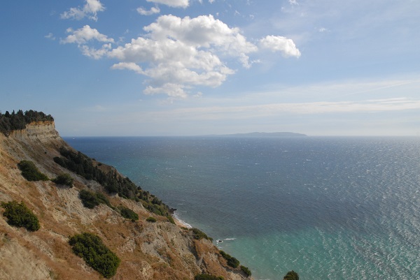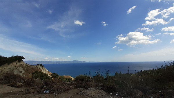Der Weg ist wirklich teilweise recht steil und steinig. Obwohl die Strecke sich zwischendurch auch wieder ganz gut hätte mit dem Roller fahren lassen, bereue ich meine Entscheidung zu Fuß weiter zu gehen nicht. Schließlich erreiche ich eine Kuppe mit Blick auf eine Klippe. Genau hier ist das Kap Asprokavos, die Südspitze der Insel Korfu! Ich mache also im Geiste einen Haken hinter die Aufgabe, die Insel bis zum Südende zu durchfahren. Doch es geht noch weiter…