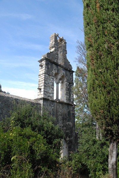 Am Kloster treffe ich erst ein junges, deutsches Pärchen. Der junge Mann kraxelt mutig auf der Ruine rum, bekundet aber, dass sich von oben keine besonderen Fotomotive bieten. Ich finde es gut, wenn andere ihre Knochen riskieren! Hinter dem eigentlichen Klostereingang ist noch der Rest eines kleinen Tonnengewölbes, vielleicht eine Kapelle oder ein Lagerraum, mit einem improvisierten Altar. Vom Kloster stehen noch die Grundmauern und der Glockenturm. Der Altarraum ist eingestürzt und nur unter Gefahr zugänglich. Ich lasse es bleiben.