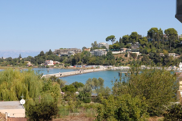 Am anderen Ende des Stegs erhebt sich die Anhöhe von Kanoni. Die Erhebung, an deren Stelle früher einmal die antike Stadt gewesen sein soll, ist heute bis auf den letzten Quadratmeter zugebaut mit Hotels, Restaurant und Cafés. Vom traditionellen Kafenion von Kanoni, bis heute ein beliebtes Ausflugsziel der Städter, habe ich letztes Jahr auf den Steg herunter gekuckt. Heute schaue ich von unten herauf. Den Aufstieg werde ich mir sparen.