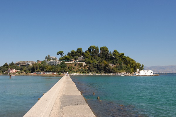 Zu Füßen von Kanoni ist eine kleine Anlegestelle für Fischerboote und einige kleine Fährschiffe. Über den Anleger gelangt man zum Kloster Vlacherna, dem touristischen Hotspot von Korfu und – wie oben erwähnt – Fotomotiv Numero uno. Das Kloster wurde 1685 auf einer nur wenige Quadratmeter großen Felseninsel errichtet. Heute steht das ehemalige Nonnenkloster weitestgehend leer. Nur der Blumengeschmückte Klosterhof, die kleine Kapelle zu Ehren der Jungfrau Maria und ein Souvenirschop werden heute noch betrieben.