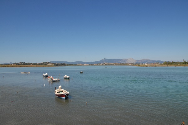 Links vom Steg die Lagune. Einige kleine Fischerboote säumen das Ufer. Auf der anderen Seite die Start- und Landebahn des Flughafens von Kerkyra, dahinter die Stadt und am Horitont der Pantokrator, der höchste Berg der Insel und bis zu diesem Tag für mich unerreichbar. Wir werden sehen…