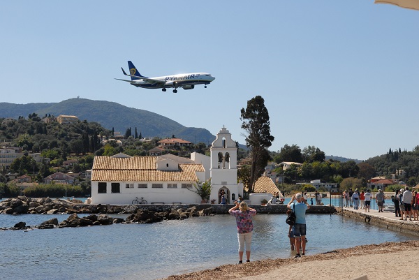 Doch der Kanoni-Perama-Steg ist noch für etwas berühmt. Etwa in der Mitte des Stegs steht immer ein kleines Knäuel von Schaulustigen. Dass sie ihre Kameras in Bereitschaft halten, lässt auf den Zweck ihres Aufenthalts hier mutmaßen. Und schon bald schwebt die Erklärung herbei: es sind Planespotter, denn nur selten kommt man einem Flugzeug im Flug so nahe, wie hier.