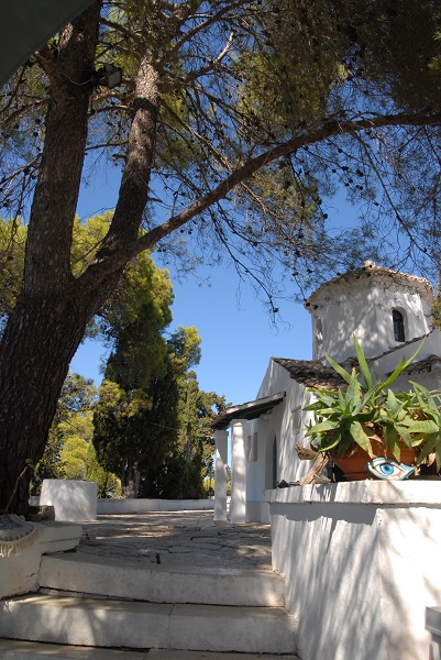 Die kleine Insel selbst ist von Zypressen und Pinien bewachsen, dazwischen Kakteen und dornige Büsche. An der Seeseite sind Felsen wallartig aufgetürmt, wohl um die Insel vor hohem Seegang zu schützen. Über eine Treppe erreicht man die kleine Kirche auf der künstlichen Anhöhe. Von hier hat man einen schönen Blick zurück zu den Hotels und Cafés von Kanoni, ebenso zu den Hotels, die sich mit ihren Fundamenten in die Felsküste gekrallt haben auf der anderen Seite. Von Zeit zu Zeit gleitet ein Urlaubsflieger vorbei.