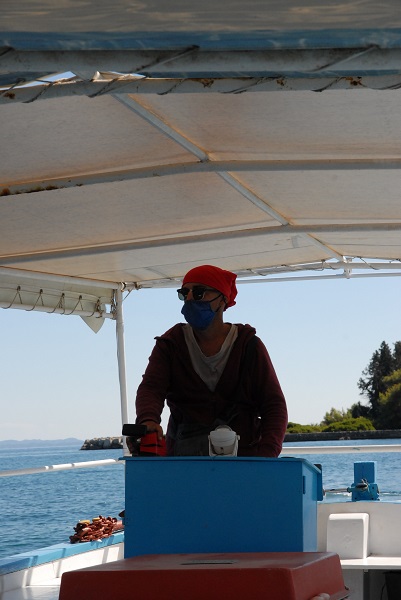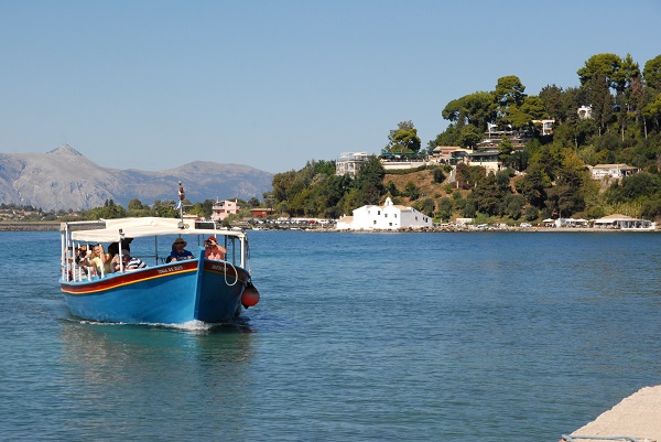 Für meine Überfahrt musste ich einen Charons-Jünger anheuern. Schließlich wollte ich nicht schwimmen, wie weiland die Kaiserin Sisi, die damit ihre Leibwache in die Verzweiflung trieb. Am Steg zum Vlacherna-Kloster spreche ich beim greisen und freundlichen Zahlmeister vor. Charons Nachfahre sieht eher aus wie ein Steuermann aus „Pirats of the Caribbean“. Dunkle Sonnenbrille, Dunkler Pullover und ein rotes Kopftuch. Noch während ich beim Zahlmeister meinen Obolus entrichte, schlendert er langsam zu seinem Boot, macht die Leinen los und legt in dem Augenblick ab, in dem ich die Reling erreiche.