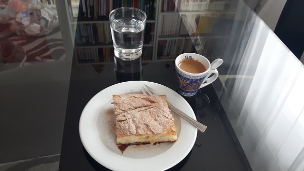 Spitiká Trígona me kréma, hausgemachte Trigoma mit Cremefüllung. Frisch aus dem Ofen und natürlich mit einer leichten Schicht Puderzucker überzogen. Dazu natürlich ein griechischer Mokka, metrio, also mittelsüß. Der bittere Kaffee passt prima zu den knusprigen Blätterteigtaschen mit der süßen Füllung – genau wie in Griechenland!