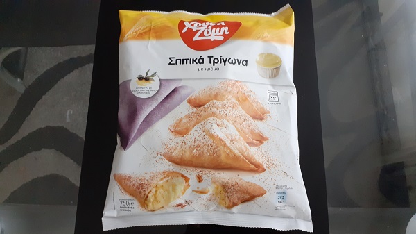 Fündig wurde ich diesmal in der Tiefkühltruhe: mit Spitiká Trígona me kréma und Tyropitákia me féta kai myzíthra habe ich mir zwei leicht zuzubereitende Leckereien ins Haus geholt. Leicht zuzubereiten, weil man sie einfach nur im Ofen aufbacken muss. Leckereien, weil sie so schmecken, wie ich sie von Korfu, Kos oder Rhodos kenne.