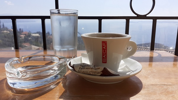 Der ideale Ort für eine Verschnaufpause – und einen griechischen Kaffee. Schließlich sitze ich ja auch in einem Kafenio, wie es griechischer gar nicht sein kann. Also ließ ich die Atmosphäre auf mich wirken und sammelte gleichzeitig Schwung für den zweiten Teil des Anlaufs auf den Patokrator.