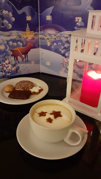 So wird ein Nachmittags-Kaffee schon alleine durch die Lebkuchen zum vorweihnachtlichen Event. Das ist es fast redundant, dass der Milchkaffee mit italienischem Mandelsirup gesüßt wurde. Und die kleinen Sternchen auf dem Milchschaum sind aus Zimt. Ich gewöhne mich gerade daran – und an die Lebkuchen!