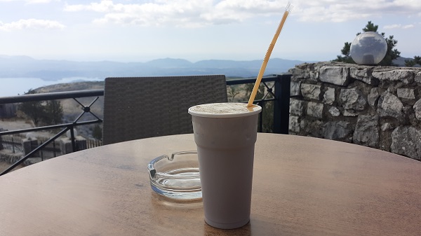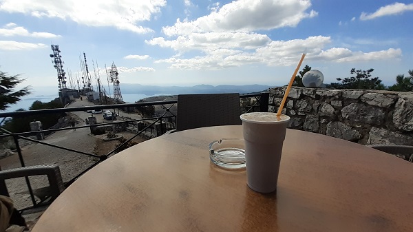 Am Gipfel angekommen durchforste ich erst den Antennenwald – der Aussicht wegen – und lasse mir dann einen Frappé schmecken. Leider wieder im Plastikbecher! Aber es hilft ja nichts. Nachdem ich meine Beine wieder spüre besuche ich auch noch die Klosterkirche und stehe ihm Auge in Auge gegenüber. Dem Pantokrator, dem Allbeherrscher…