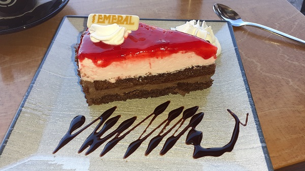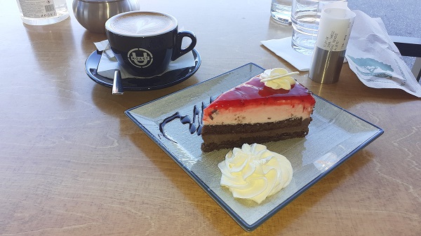 Ich suche mir ein leckeres Stück Torte aus, eine Schokotorte mit Erdbeertopping stilvoll serviert. Zusammen mit dem heißen Cappuccino genau das, was ich jetzt brauche! Wie die meisten griechischen Konditorwaren ist mein Kuchen zwar sehr süß, aber mindestens ebenso lecker. Langsam kehren die Lebensgeister wieder in mein Glieder zurück. Das letzte Stück ist jetzt nur noch ein Katzensprung.