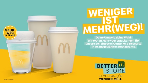 McDonald’s Deutschland geht den nächsten Schritt auf seiner 2019 veröffentlichten Roadmap für weniger Plastik und Verpackungsmüll. Seit November testet das Unternehmen in 10 Restaurants – darunter Filialen im Raum München und in Berlin – die Ausgabe der beliebtesten Getränke und Desserts in eigenen Mehrwegverpackungen für den Inhouse- und To-go-Verzehr. Die Ausgabe der Produkte in den neuen Mehrwegverpackungen erfolgt auf Nachfrage der Gäste und für Bestellungen im Restaurant und am McDrive.
