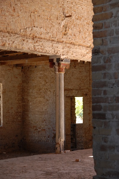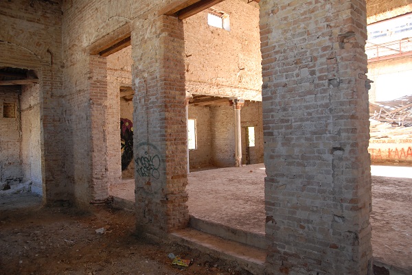 Ein paar Schritte die Straße hinunter zieht ein weiteres Gebäude meine Aufmerksamkeit auf sich. Wie ich später in Erfahrung bringe ist es das ehemalige Theater Phönix, jetzt ein Lost Place mit nicht abgeschlossener Türe. Ich betrachte das als Einladung. Innen schon leidlich entkernt, lassen einige Verzierungen an den Säulen etwas von der früheren Pracht erahnen. Vor meinem inneren Auge entsteht das Bild eines luxuriösen Kaffeehauses mit Marmorfußboden und großen Leuchtern. Leider habe ich für dieses Investment gerade das Kapital nicht zur Hand.