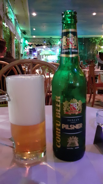 Zum Stifado gibt es ein Pils von der Corfu Beer Brewery, der einzigen auf der Insel ansässigen Brauerei im kleinen Ort Arillas Agiou Georgiou. Die kleine aber feine Brauerei produziert hauptsächlich für die Insel und will sich bewusst von den Marken der großen Bierkonzerne abheben. Inhaber Spiros Kaloudis versteht sich als regionaler Anbieter von Bierspezialitäten. Das ist alles sehr schön, nur mir ist dieses Bier zu bitter – was eine reine Geschmackssache ist.